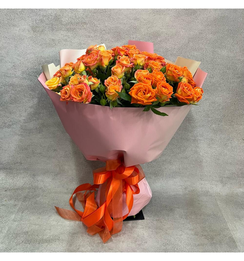 Монобукет из оранжевых роз - это яркий и жизнерадостный подарок, который символизирует энергию, радость и тепло. Оранжевый цвет роз олицетворяет живой огонь страсти и дружеских чувств, что делает этот букет идеальным выбором для выражения благодарности и поддержки близким людям. Оранжевые розы также могут символизировать желание и удачу, что делает их отличным подарком на начало нового пути или важного события. Этот яркий букет привнесет в любую обстановку нотку тепла и радости, а его яркие оттенки будут радовать глаза получателя на протяжении долгого времени.